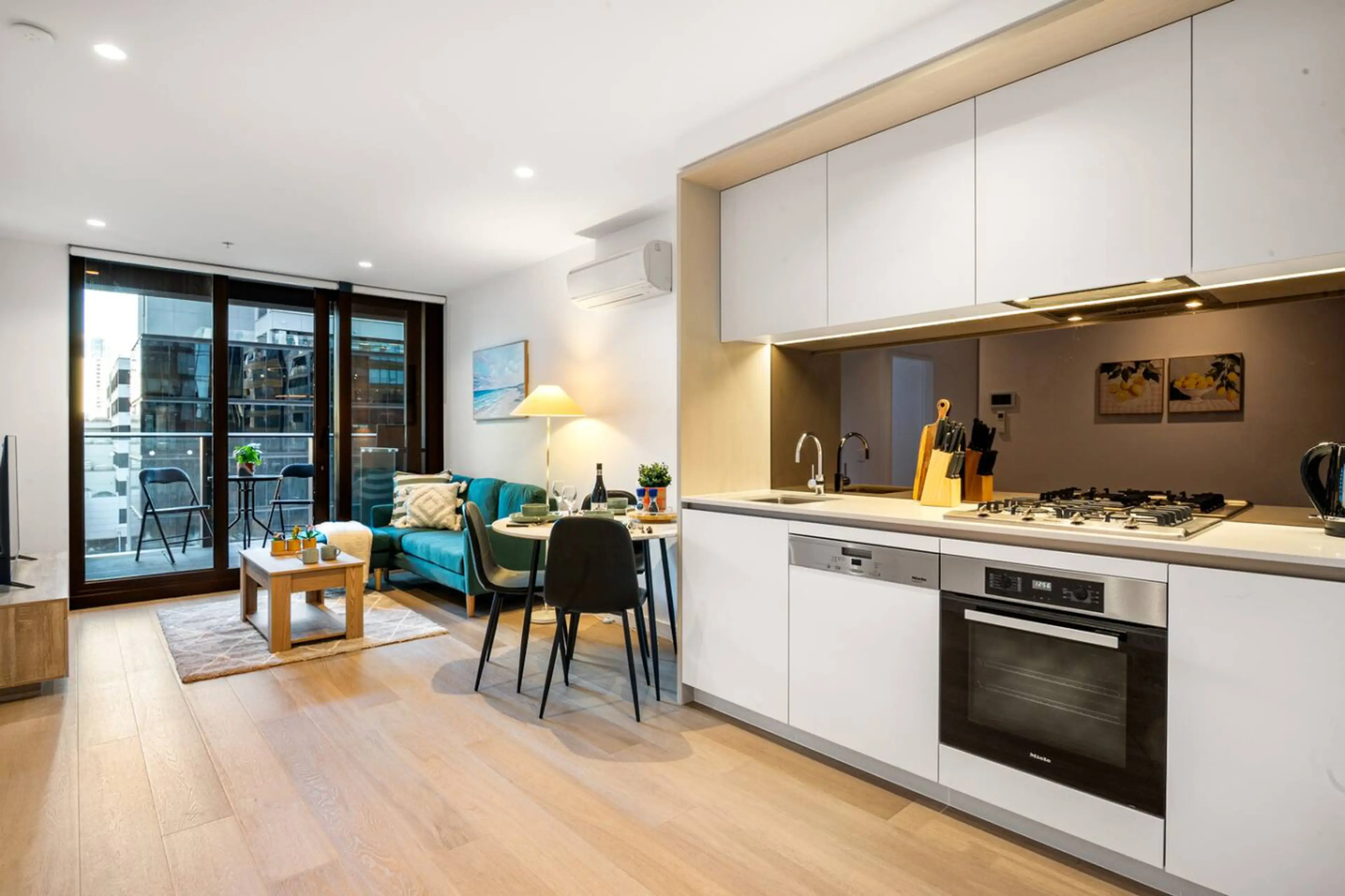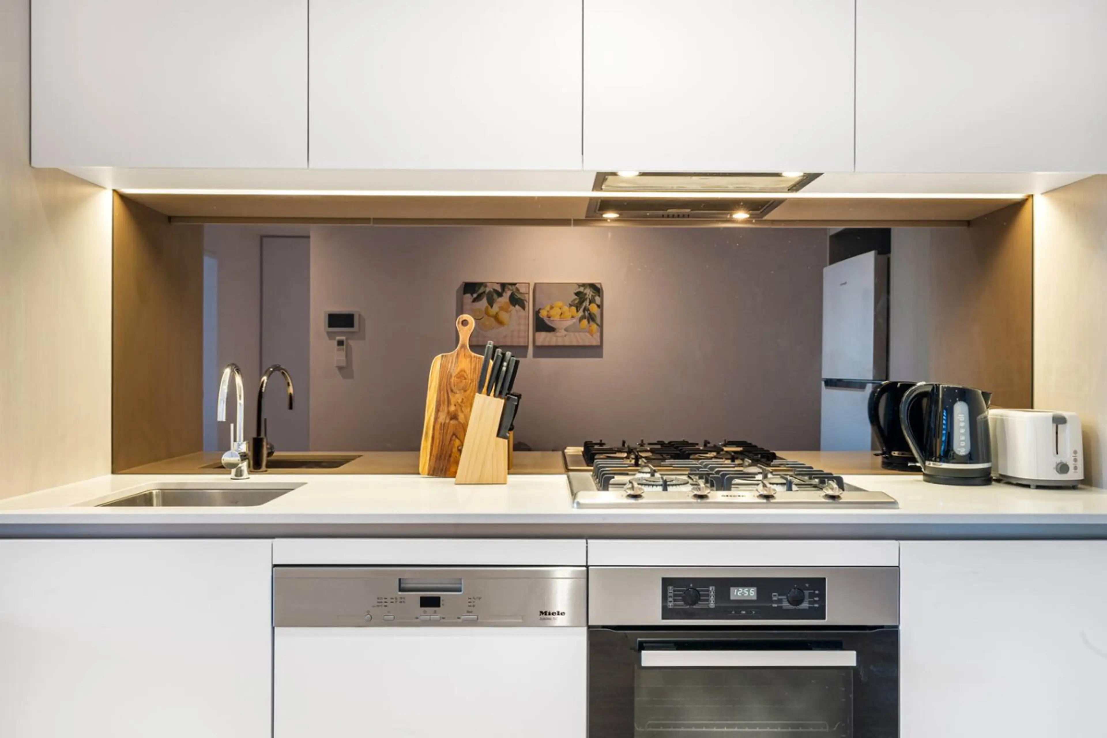 Stylish one-bedroom city stay in a secure high-rise. Self check-in key locker; arrive whenever you like after 3 pm. Relax in the light-filled lounge, stream on the smart TV, and stay connected with fast Wi-Fi. Sleep well on a queen bed with quality linen; blackout curtains help you sleep in. Kitchen...